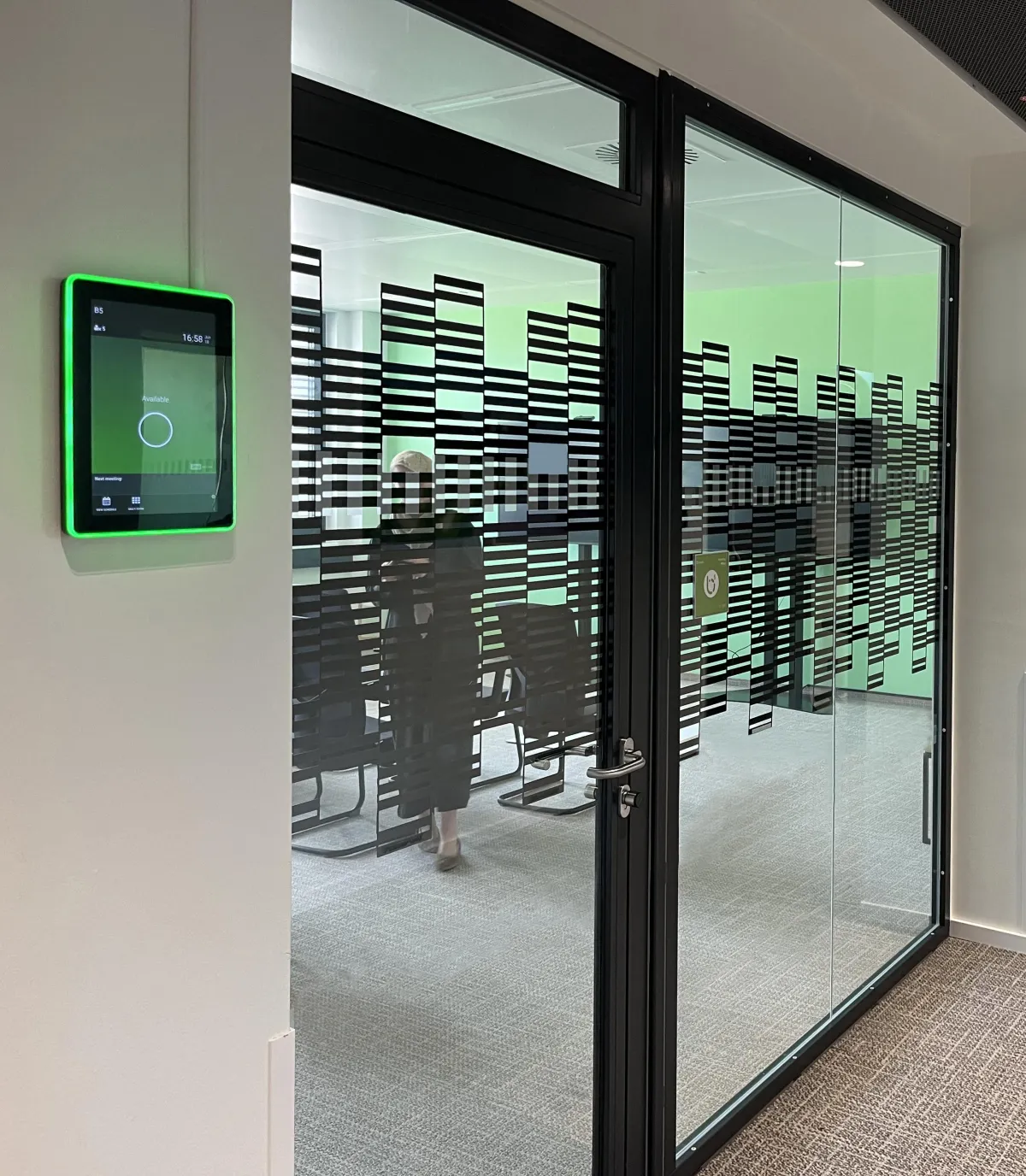 Dünne Screens von der Decke hängend oder dünn wie Folie auf Glaswänden befestigt und abnehmbar.