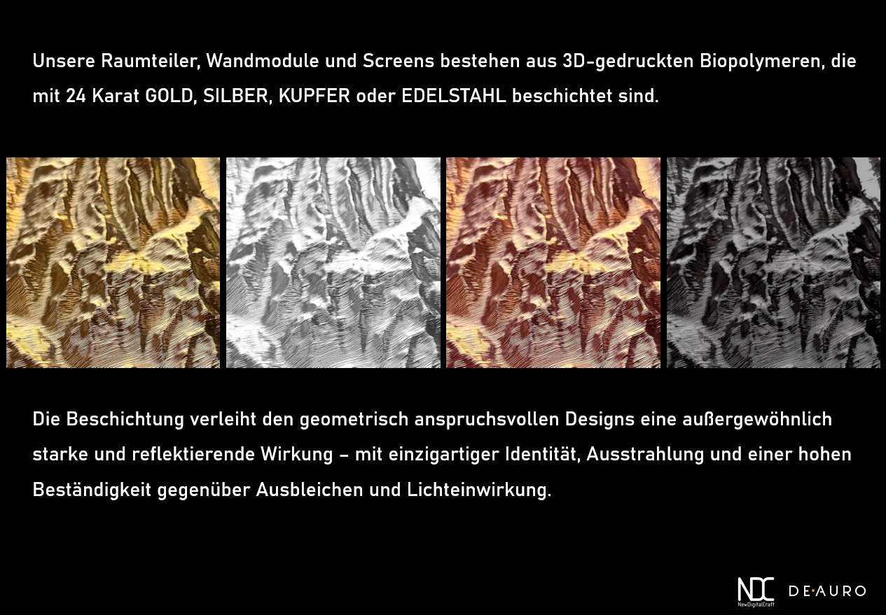 Eine weitere besondere Expertise von NDC liegt in der metallischen Veredelung von 3D-gedruckten Bauteilen. Unsere Raumteiler, Wandmodule und Fliesen bestehen aus 3D-gedruckten Biopolymeren, die mit 24 Karat Gold, Silber, Kupfer oder Edelstahl beschichtet werden. Diese metallische Oberfläche unterstreicht die geometrische Präzision und verleiht den Designs eine außergewöhnlich starke, reflektierende Wirkung – mit einzigartiger Ausstrahlung, Identität und hoher Beständigkeit gegenüber Licht und Alterung.